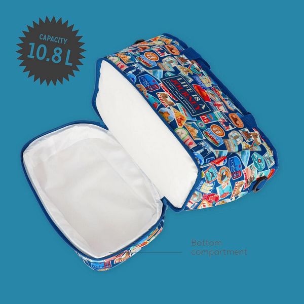 Votre allié pour les repas collectifs au bureau, les balades ou les journées à la mer : le Sac à Repas en matériau Isotherme sur le thème Travel Stickers de Legami. Grand format avec Capacité de 10,8 litres. Doté de 2 compartiments avec fermeture à glissière, 1 poche avant et bandoulière.