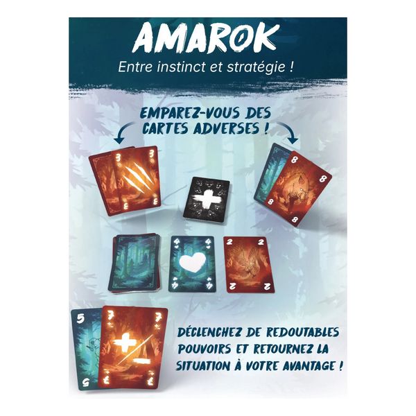 Amarok est un jeu compétitif et familial de déduction et de bluff ! Entre instinct et stratégie, emparez-vous des cartes adverses et déclenchez de redoutables pouvoirs pour retourner la situation à votre avantage.