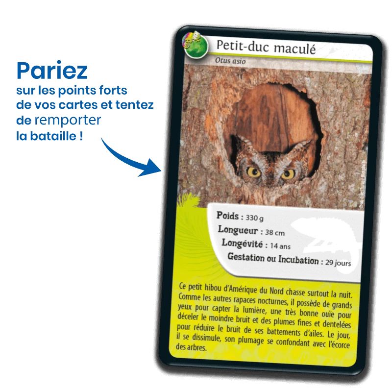 Le principe de Défis Nature – Rois du camouflage est simple : les enfants de 7 ans et + parient sur les points forts des animaux. Le joueur qui possède la plus forte caractéristique remporte les cartes des autres joueurs. Le premier à collecter toutes les cartes du jeu gagne la partie.