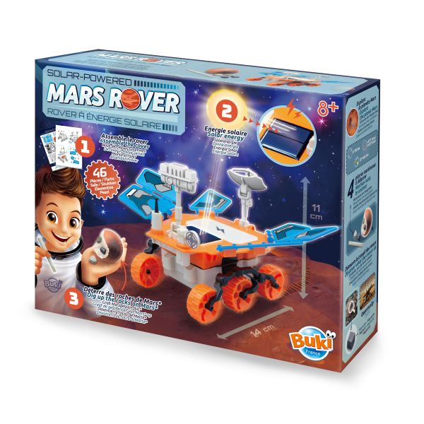 Le véhicule avance grâce à l’énergie solaire, et peut également fonctionner avec une pile LR06-AA non incluse, permettant de jouer même sans lumière du Soleil.