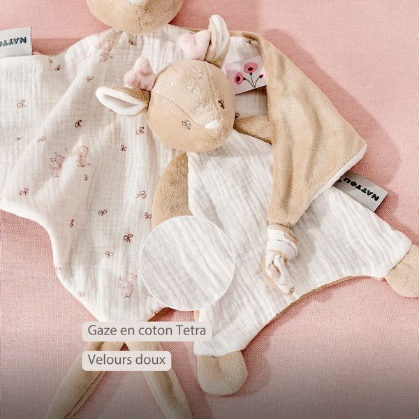 Doudou doux en forme de faon, adapté dès la naissance
