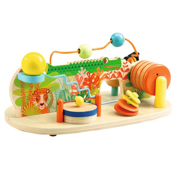 L’enfant tourne autour pour jouer et découvrir comment faire les 8 différents sons : toc toc fait le perroquet à ressort sur un cylindre en bois, clac clac fait la roue qui tourne, tac a tac a tac… fait la bille le long du dos du crocodile, dling dling fait le bruit métallisé du cylindre qui tourne, cling fait la bille en fin de course quand elle tombe sur la cymbale, pong fait la bille sur l’élastique quand elle touche le tambourin, ting ting ting fait la grosse boule en dévalant le toboggan métallique, tic i tic font les disques en s’entrechoquant.