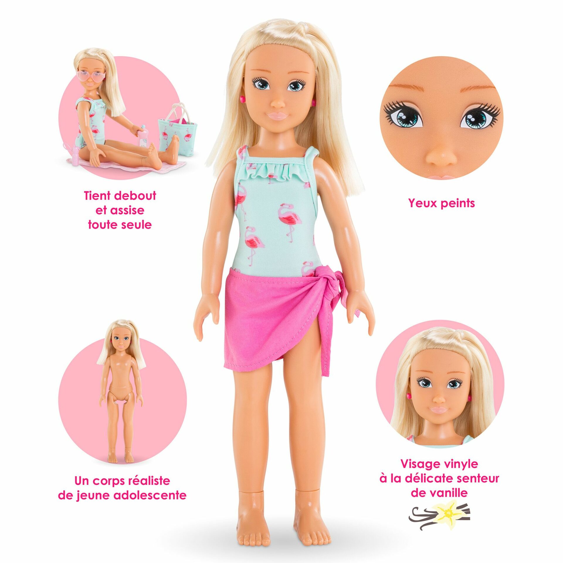 Ses yeux sont peints et elle possède des cheveux blonds mi-longs. Elle porte 1 joli maillot de bain, 1 paréo assorti et 1 paire de boucles d’oreilles amovibles. Valentine a un corps réaliste de jeune adolescente.