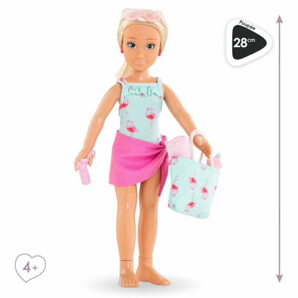 Le coffret Valentine à la plage est composé de Valentine, poupée mannequin de 28 cm, et de 5 accessoires : 1 crème solaire protectrice, 1 paire de lunettes de soleil, 1 gourde, 1 serviette de plage et 1 sac de plage. Valentine a un joli visage naturel aux traits fins qui sent bon la vanille.