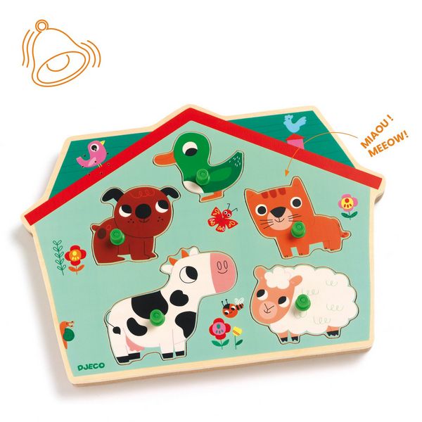 Ouaf Woof est un puzzle d’encastrement sonore en bois sur le thème de la ferme. Wouf, Miaou, Coin-coin, Bê-bê, Meuh ! L’enfant remet chaque animal à sa place pour découvrir son cri.