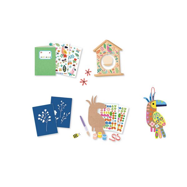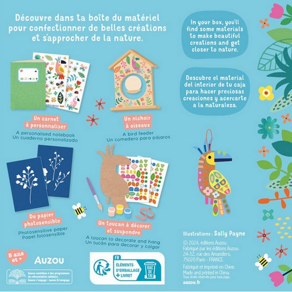 Inclus : un livret de pas à pas, un carnet à personnaliser, une mangeoire à oiseaux, un toucan à décorer et à suspendre, du papier photosensible.