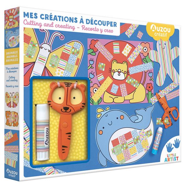 Un coffret contenant une paire de ciseaux, un tube de colle et 15 feuilles pour réaliser les activités suivantes : découpage, collage, pliage et tressage.