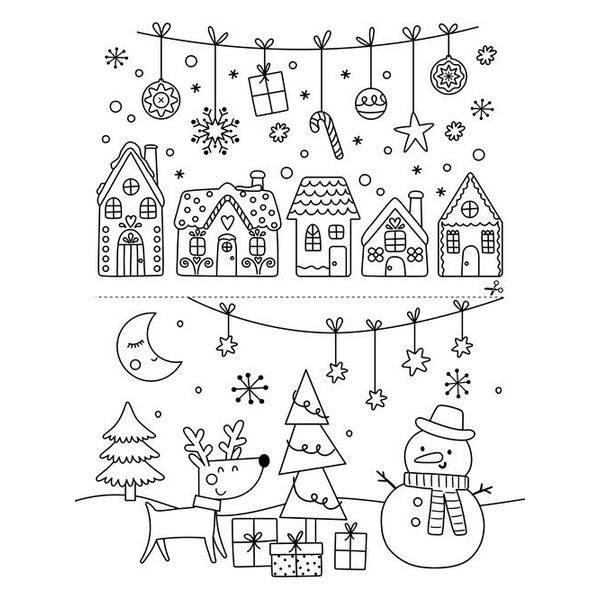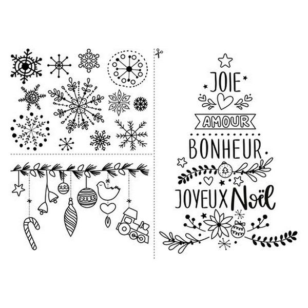 6 scènes grand format : un village de Noël, des rennes, des boules et des guirlandes, des bonshommes de neige et des flocons…