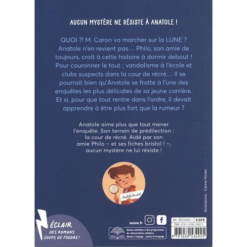 L’une des enquêtes les plus délicates d’Anatole Bristol… De quoi ? Monsieur Caron va aller sur la LUNE ? Mais c’est quoi, cette histoire ? Anatole n’en revient pas…