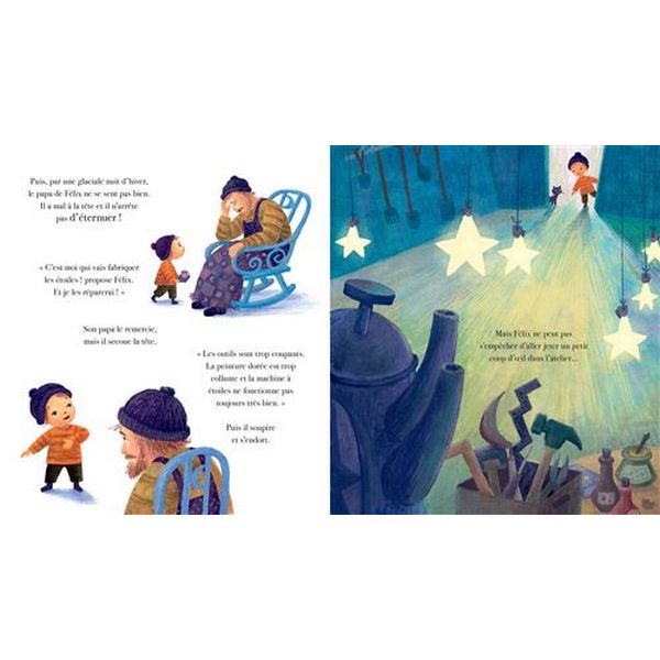 Tous les soirs, le papa de Félix fabrique et répare les étoiles pour illuminer le ciel. Félix aimerait beaucoup l’aider et embellir les étoiles à sa façon, avec des boutons, des paillettes et des rubans ! Mais son père lui répond que les gens n’aiment pas le changement…