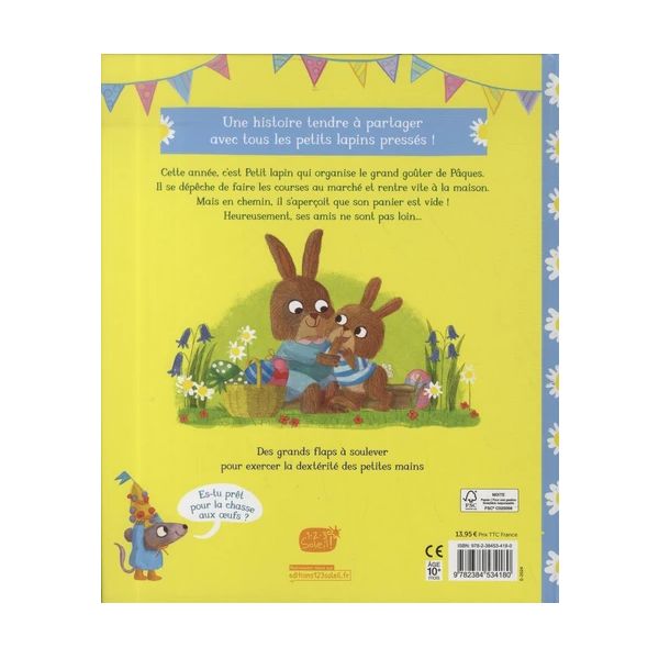 Cette année, c’est Petit lapin qui organise le grand goûter de Pâques. Il se dépêche de faire les courses au marché et rentre vite à la maison. Mais en chemin, il s’aperçoit que son panier est vide ! Petit lapin s’est tellement dépêché qu’il a semé toutes ses provisions en chemin. Heureusement, ses amis l’ont suivi en secret…