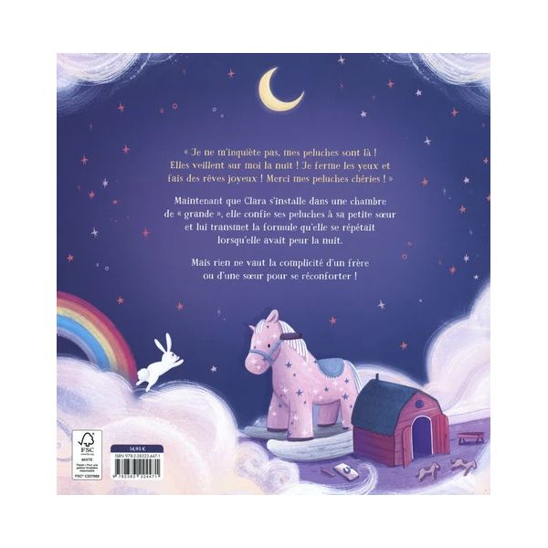 Une histoire qui célèbre les jolis moments de complicité entre deux soeurs. Clara est ravie de dormir pour la première fois dans sa propre chambre, une chambre de grande fille ! Mais sa petite soeur, Elsa, appréhende de dormir dans leur ancienne chambre sans elle. Alors Clara imagine un plan : elle donnera à sa petite soeur toutes ses peluches et, chaque fois qu’Elsa aura peur, elle pourra les serrer contre elle et se rappeler ce que chaque animal représente : le courage, la créativité, l’amour et l’imagination.