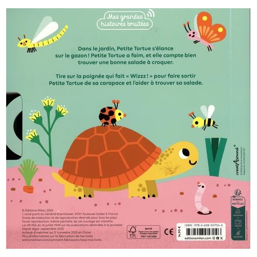 Au jardin, tout est calme. “Flap flap flap” , font les petites bêtes qui agitent leurs ailes. Quand soudain, Petit Tortue sort la tête de sa carapace et s’élance sur le gazon : “Wizzz” ! Petite Tortue a faim et elle compte bien trouver une bonne salade à se mettre sous la dent. “Mes grandes histoires bruitées” : une collection d’albums animés grand format qui font des bruits rigolos ! Dans cet album, le tout-petit, dès 1 an, suit l’aventure d’une petite tortue gourmande dans un jardin potager.
