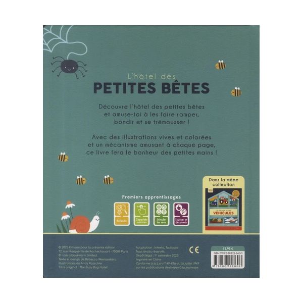 “Découvre l’hôtel des petites bêtes et amuse-toi à les faire ramper, bondir et se trémousser ! Avec des illustrations vives et colorées et un mécanisme amusant à chaque page, ce livre fera le bonheur des petites mains ! ”